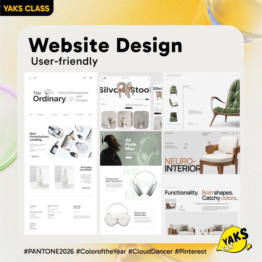 แนะนำให้ใช้สี Cloud Dancer เป็นสีหลัก 90% ของงาน (Rule 60-30-10) แล้วตัดด้วยตัวอักษรสีเทาเข้มหรือสีทองหม่น จะช่วยให้แบรนด์ดูเหมือนแบรนด์สกินแคร์หรือสปาระดับ Hi-end ทันทีค่ะ